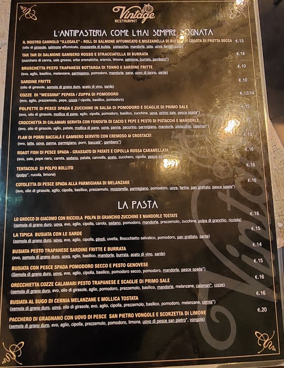 Welcome to Vintage Restaurant, a culinary gem located in the heart of Trapani, Italy. Specializing in Mediterranean and Sicilian cuisine, this eatery promises a delightful journey of flavors. The menu is a celebration of fresh seafood, featuring standout dishes like expertly grilled whole tuna and vibrant octopus salad, all celebrated for their rich, yet balanced ingredients.